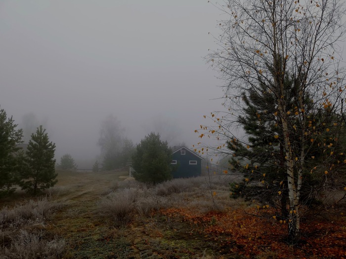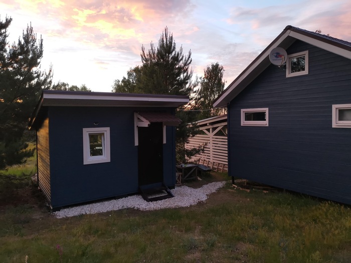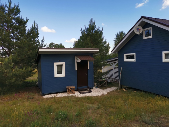 Над "крыльцом" сделал навес - не ленитесь, он нужен обязательно. Закрывает дверь и лестницу от дождя, зимой от снега. Сарай обшил вагонкой и покрасил в цвет дома фасадной Тиккурилой.