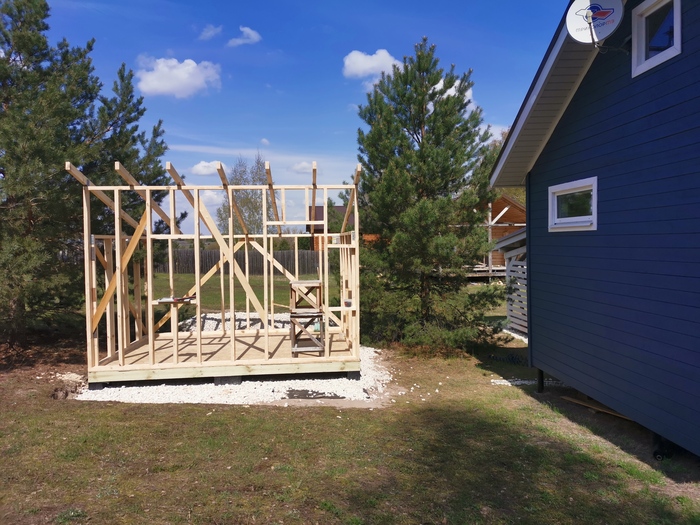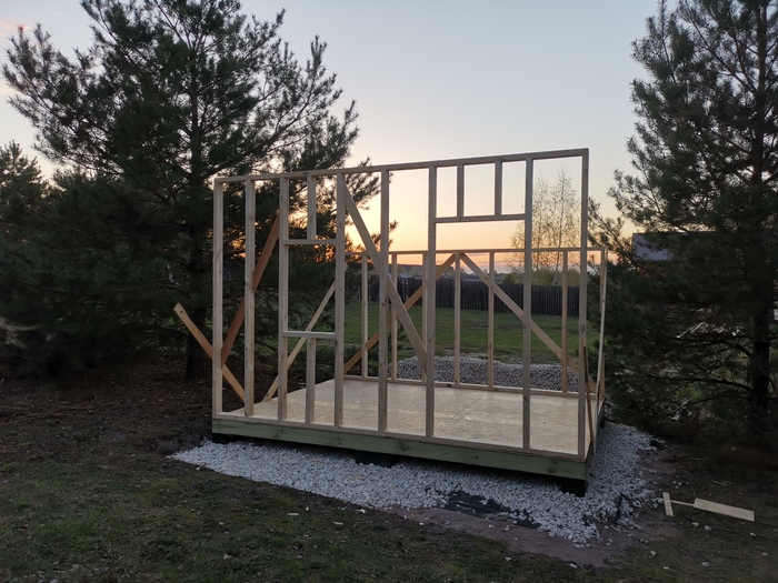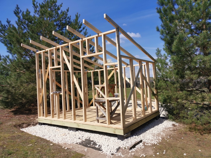 Сначала собрал нижнюю "плиту", пропитал лаги антисептиком, накрыл пароизоляцией и зашил сверху ОСП 9 мм. Затем собирал стены. Особенно тяжело было поднимать фронтальную, она высотой 3 м.