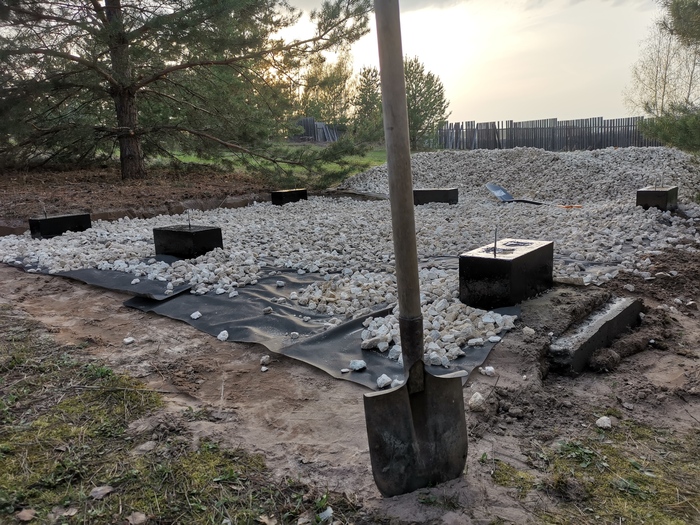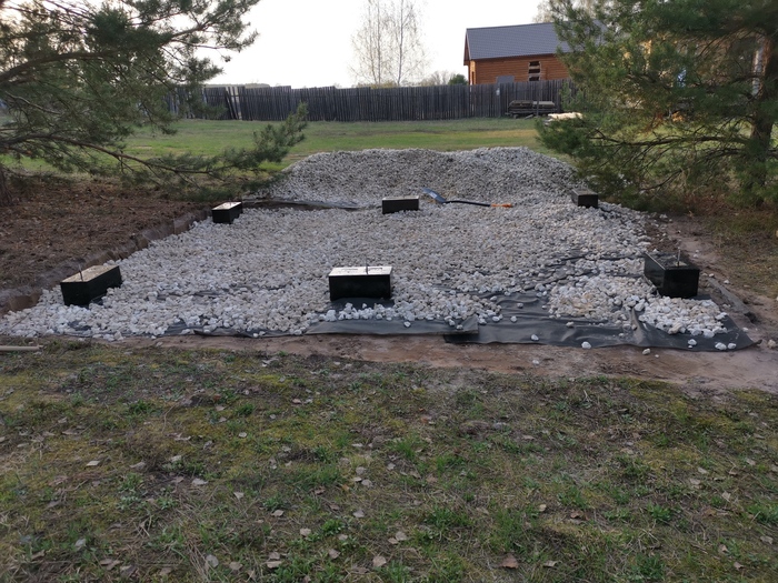 Блоки покрыл мастикой для, фундамента, пространство под сараем застелил геотекстилем, засыпал гравием.