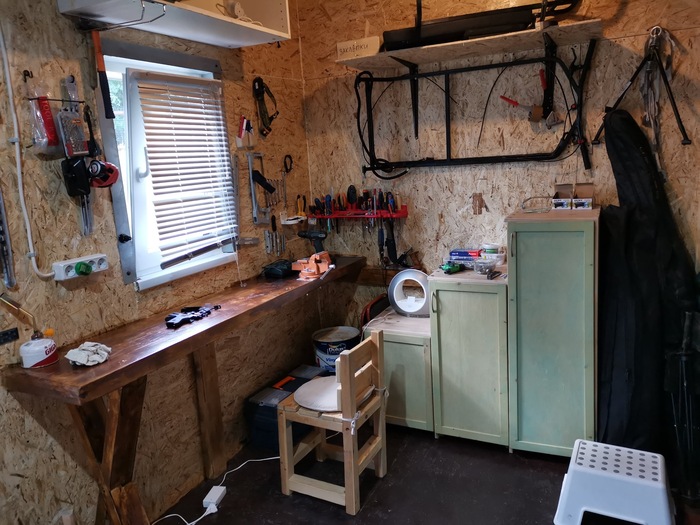 Внутри стены обшил ОСП, утеплять не стал, просто еще один слой пароизоляции под обшивку. Сделал из оставшегося материала стеллажи для крупных вещей типа лодки, коптилки, палаток и тп. Собрал небольшой верстак и поставил самодельный шкафчик. Пока небольшой бардак 😅, но со временем, эволюционным путем к какому-то порядку приду, надеюсь.
