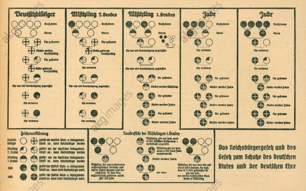 Схема, показывающая принадлежность к «германской крови» и запрещённые браки по «Закону о защите крови и чести» (Нюрнбергские расовые законы 1935 г.) ↓ ↓ ↓ ↓ ↓