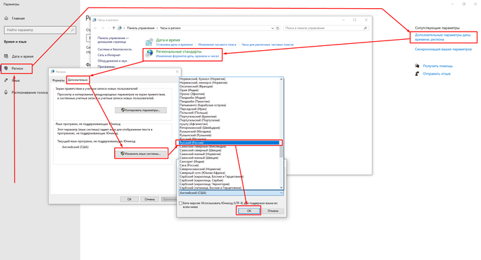 В следующем окне "Регион" перейти во вкладку "Дополнительно - Изменить язык системы (для программ, не поддерживающих Юникод)"
