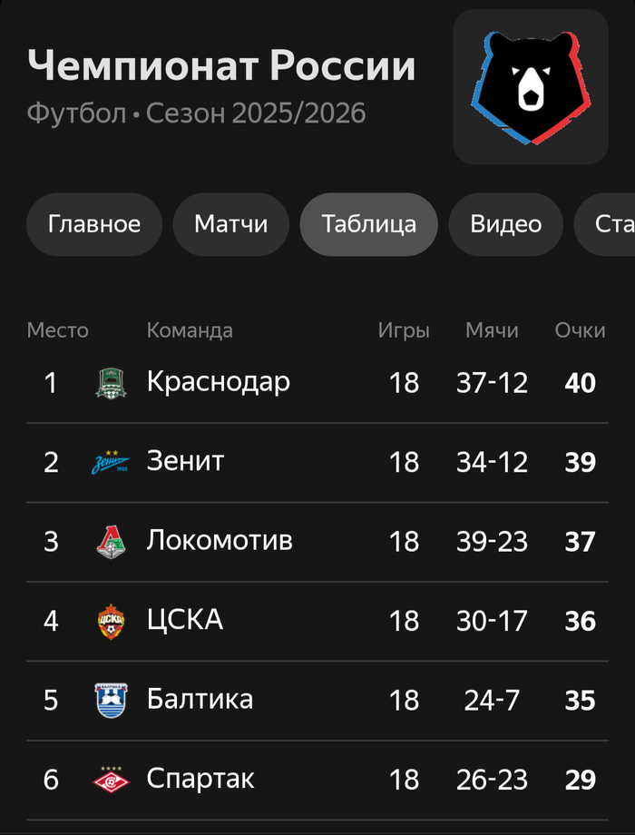 Чемпионат России становится на паузу. По итогам крайнего тура, и в частности матча Краснодар vs ЦСКА, оформилась турнирная таблица в следующем виде