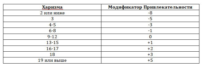 Значение Привлекательности персонажа также определяется броском 3d6, что даёт число от 3 до 18. Затем игроки сверяются с Таблицей 8: Модификатор Привлекательности (см. ниже), чтобы узнать, как показатели Харизмы влияют на итоговые показатели Привлекательности. Значение Привлекательности персонажа-человека может варьироваться от -2 до 23. Если Харизма персонажа изменяется в ходе игры, будь то из-за болезни, уродства, старения или магического воздействия, его Привлекательность следует скорректировать аналогичным образом (потеря одного пункта Харизмы приводит к потере одного пункта Привлекательности). Кроме того, некоторые новые расы имели природные положительные или отрицательные модификаторы Привлекательности.