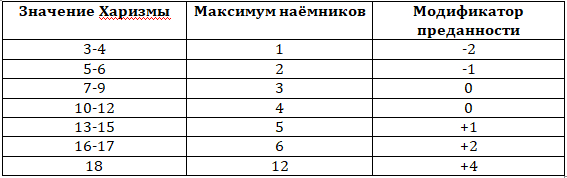 Помимо влияния Харизмы вашего персонажа, рейтинг лояльности приспешников и наёмников будет зависеть от прошлого обращения, текущей ситуации и поведения любого из их товарищей поблизости. Ваши лейтенанты, если таковые имеются, будут оказывать стабилизирующее влияние. Персонажи высокого уровня вряд ли будут иметь низкий моральный дух, если только они не столкнутся с очевидно безнадёжной ситуацией (по крайней мере, так, как они её видят) и/или когда у них мало здоровья.