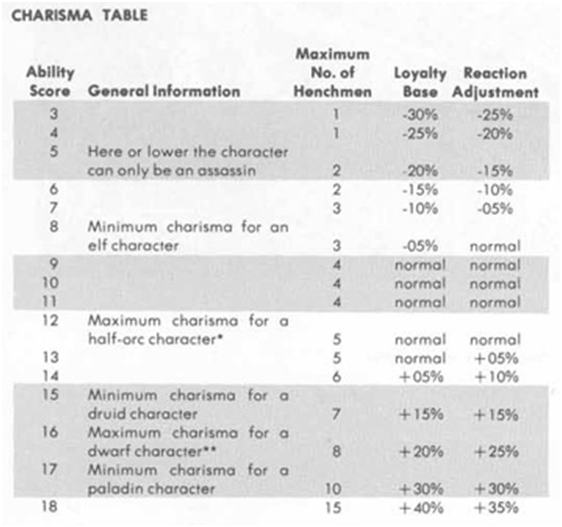 Харизма в первой редакции ADnD ещё не позволяла партийным и беспартийным бардам так эффективно соблазнять движимое и недвижимое на своём пути. Однако, она влияла на такой показатель, как Мораль (Loyalty, что, в контексте применения, можно перевести как Лояльность, Боевой дух или Моральный дух). Помните табличку и графу Loyalty Base? Вот для удержания боевого духа ваших наёмников она и нужна. Быстренько взглянем на табличку и откроем страницу 106 PHb.