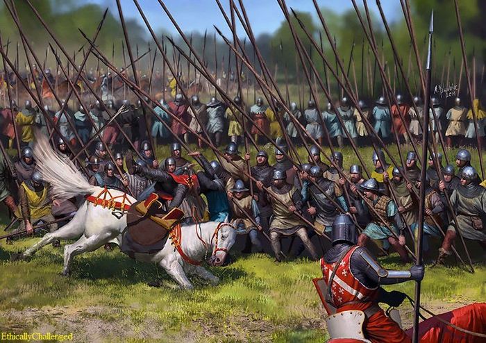 Был один момент, когда казалось, что королю Эдварду удастся выправить ситуацию. Получилось как-то накопить значительные силы на левом берегу. Как раз переправились лучники и начали интенсивно обстреливать шилтроны с фланга. Если бы таким образом удалось нарушить их строй, всё ещё сильная английская кавалерия смогла бы ворваться в ряды шотландской армии, дальше – дело техники. И дождь из стрел вполне мог это подготовить.