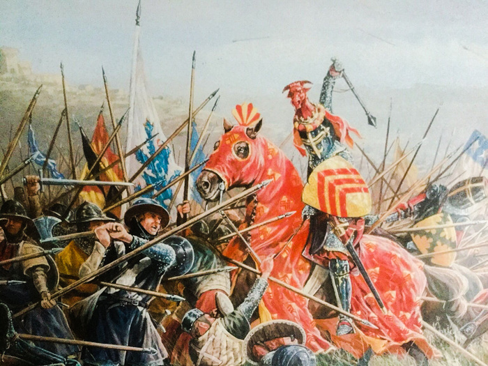 До этого считалось, что шилтрон – чисто оборонительное построение. Очень трудно держать плотный строй атакующей пехоте с длинными копьями. Но, по-видимому, не одна тренировка была проведена. Шилтрон отбросил кавалерию, Клиффорд и Бомон отступили, неся потери.