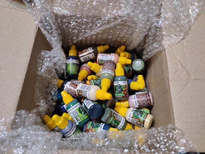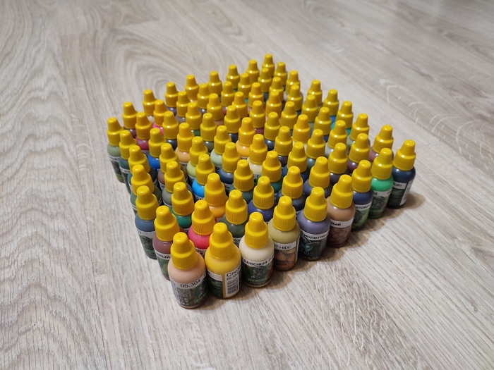 Помочь решить проблему могут полки, прикрученные к стене повыше стола в несколько рядов, а также хороший вертикальный органайзер для красок. Для своих цитаделевских красок я использую фирменные органайзеры, но только потому, что не стеснён в рабочем пространстве - на них краски стоят не друг на другом, и это сильно жрёт место