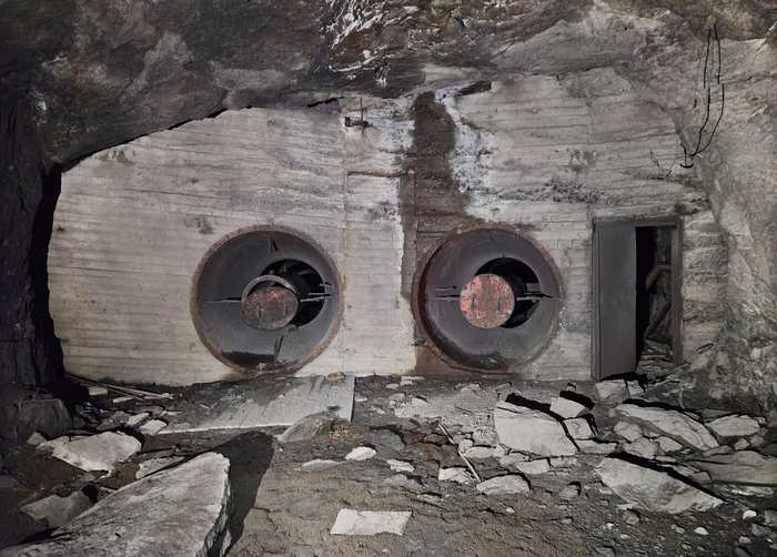 Неподалёку от "вентиляторной перемычки" находилась старая вентиляционная камера, где ранее, по всей видимости, тоже располагалось оборудование для проветривания выработок на этом горизонте. Масштабы, конечно, не такие как в заброшенном руднике «Молибден», но всё же!