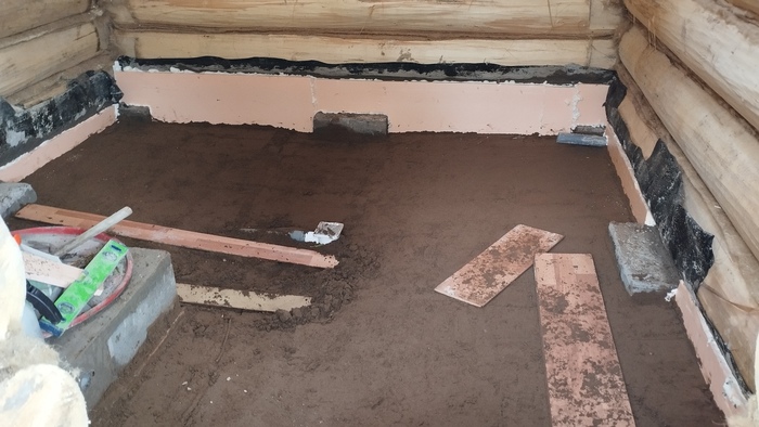 Неделю баня стояла холодная. Отопление полом я еще не включаю. На улице минуса пока нет. Включаю обогрев полом, электрокамин,