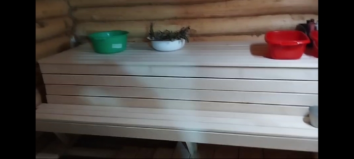 В парилке листья от березового веника не убрал с прошлой бани. Запах стоит приятный.