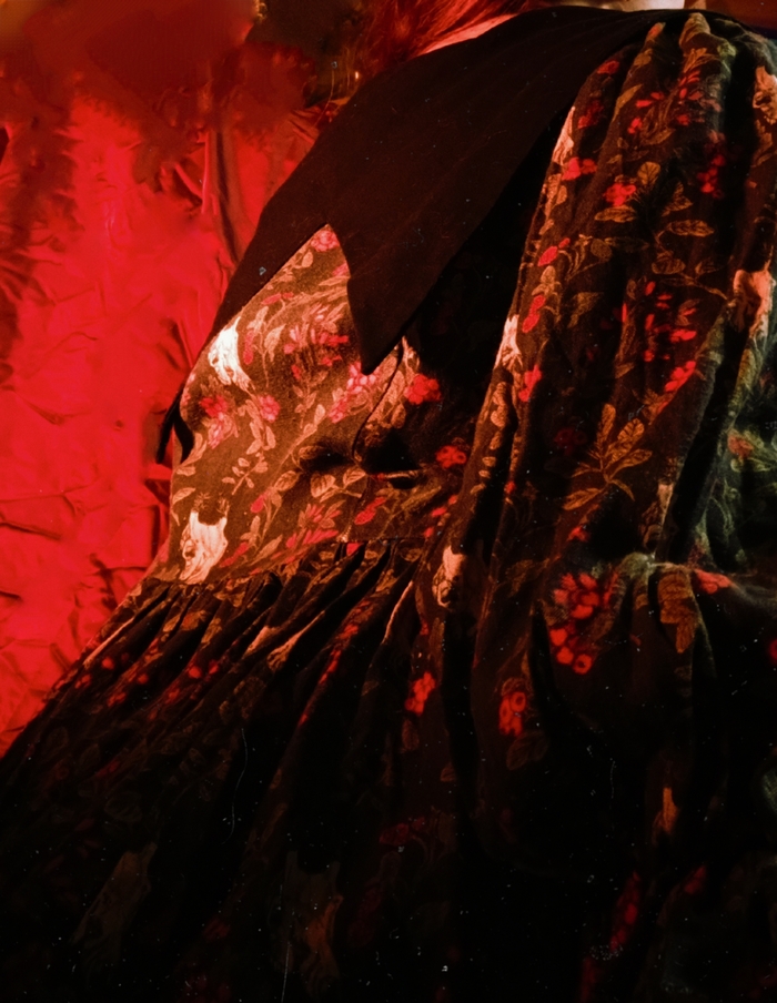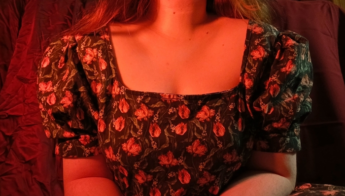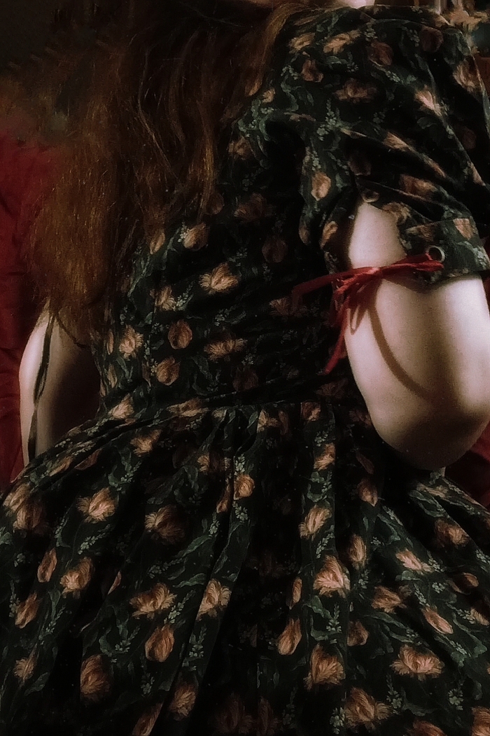 Из конструктивного: юбка платья прямоугольники, рукав-фонарик, манжета на люверсах, завязываю бантики из лент и ещё вырез квадратный. Талиевых вытачек на полочке традиционно нет, а по спинке есть.