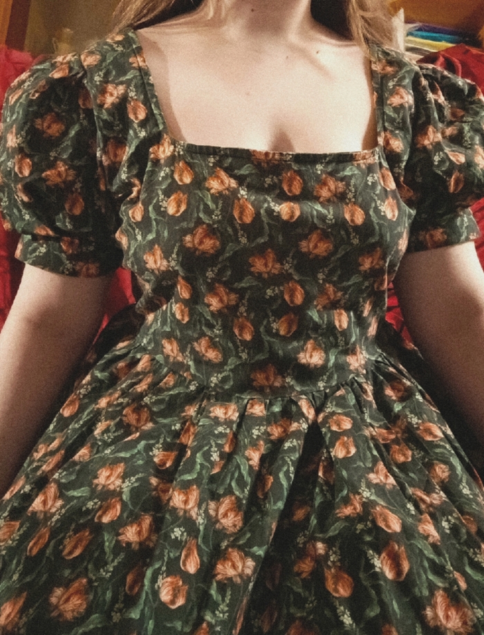 По конструкции у нас юбка платья - прямоугольники, рукав фонарик на нитке-резинке, воротник фигурный, вытачки по полочке только нагрудные из плеча, по спинке талиевые и плечевые.