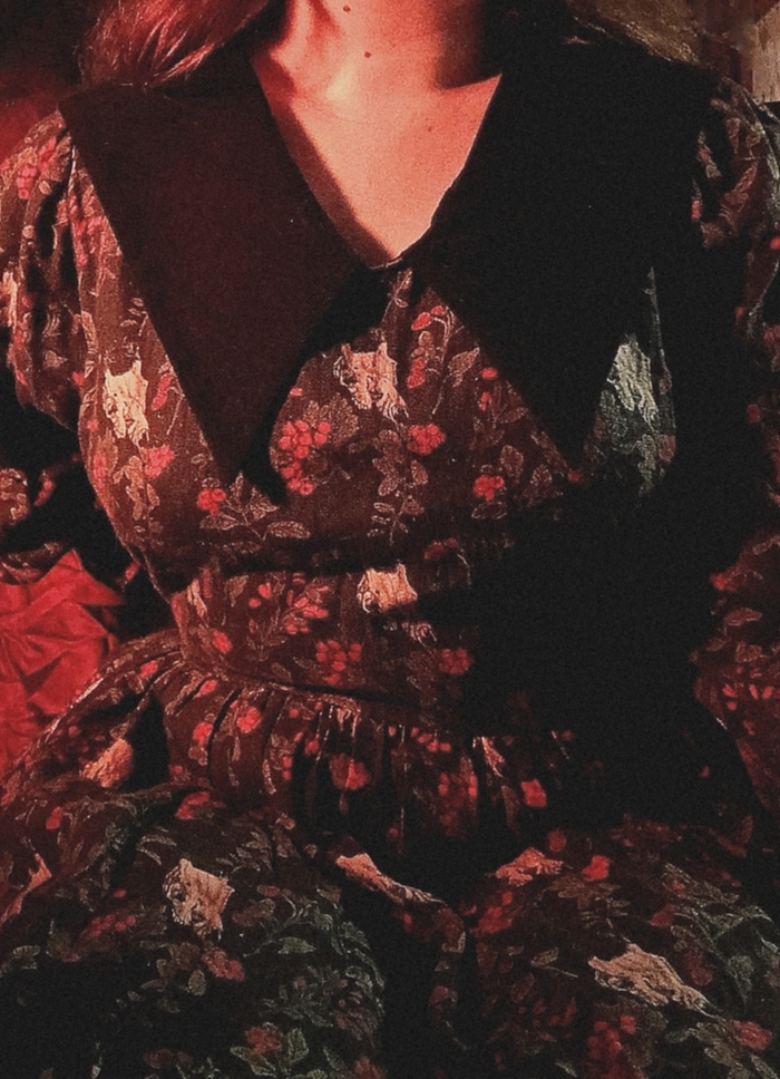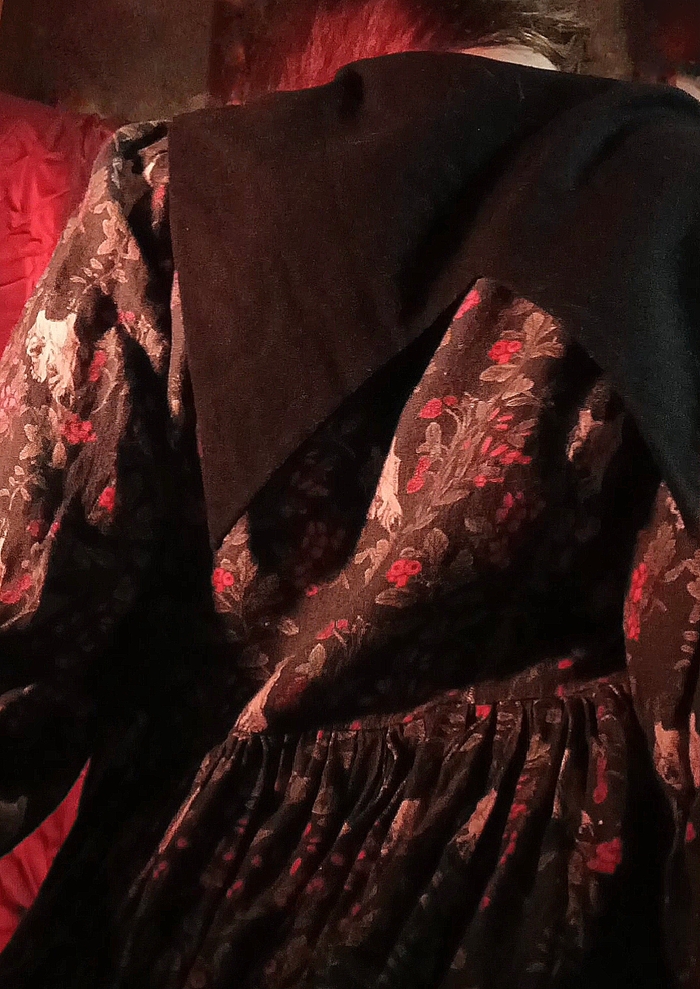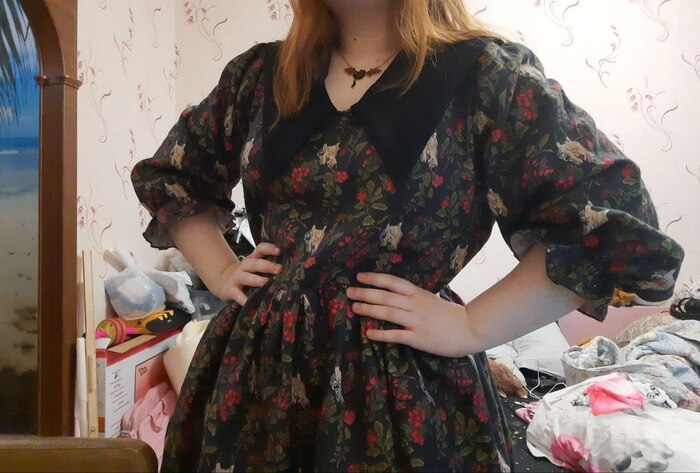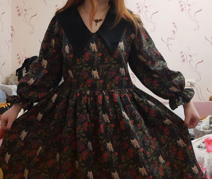Ткань воротничка что-то вроде хлопок+полиэстер. А ткань самого платья принтованный 100% лён, покупала в магазине "Жена Лесника"(я спустила на этот лён много деняг и ни о чем не жалею).