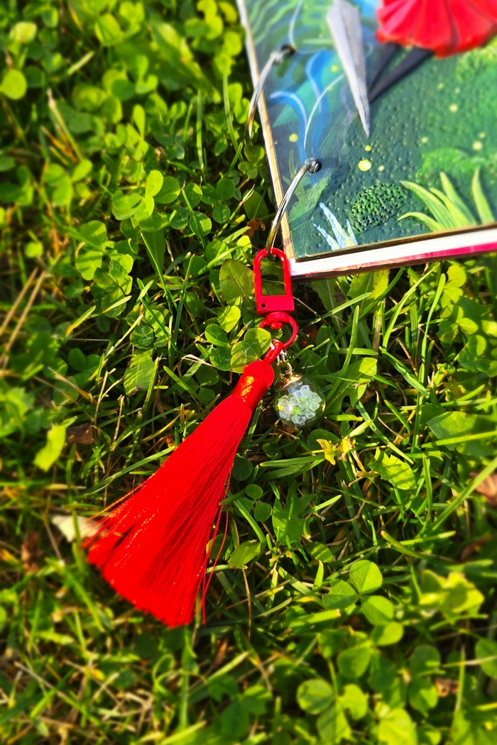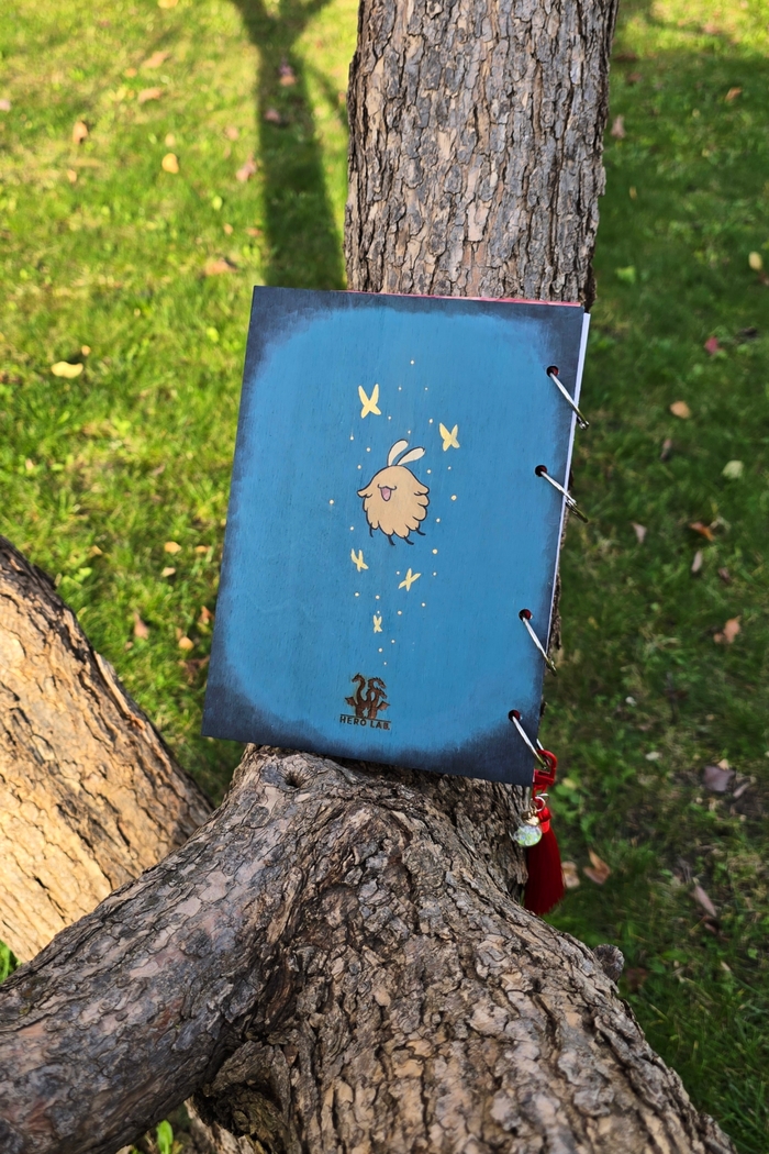 Хорнет с рыцарем на камне вылеплены в ручную и покрашены, сзади на обложке нарисована блошка. К блокноту также собрала брелок в комплект, рисунок на обложке и шарик на брелке светятся в темноте, бумагу в блокноте можно менять в любой момент благодаря разжимным кольцам.