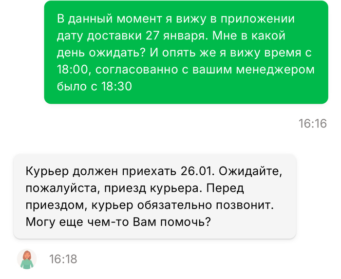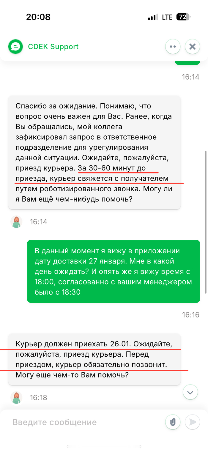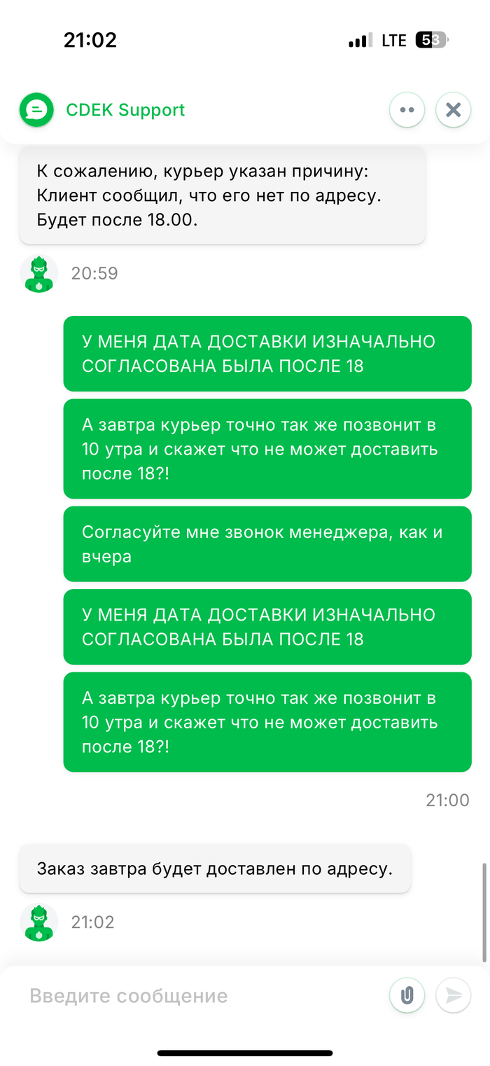 Вчера была согласованна доставка в промежуток с 15 до 18, в 11 утра звонит курьер с словами "у меня рабочий день до 15, удобно сейчас принять?" - нет не удобно я выбрал необходимый мне промежуток времени. Через несколько часов переписки с поддержкой позвонил менеджер и согласовал доставку на сегодня в промежуток с 18:30 до 22. Сегодня звонок чуть после 10 "удобно сейчас принять?" - НЕТ НЕ УДОБНО Я СОГЛАСОВАЛ ПРОМЕЖУТОК КОГДА УДОБНО! Сразу начинаются попытки переноса на следующий день. ТАК КАКОГО, ПРОСТИТЕ, ХУЯ ВЫ ВЫДАЕТЕ ЗАКАЗЫ НА ДОСТАВКУ КУРЬЕРАМ, КОТОРЫЕ НЕ МОГУТ ДОСТАВИТЬ В НЕОБХОДИМЫЙ ПРОМЕЖУТОК?!