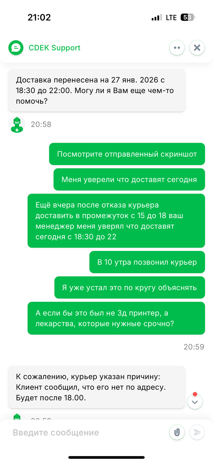 Окей, вечером пишу в СДЕК, пока еще посылка не уехала далеко. Ответ: ждите три дня, разберемся. Пишу утром, звоню. Все операторы отвечают "мы передадим кому то эту информацию, спасибо". И всё!!! Когда товар приехал в Снежинск мне звонит курьер и уточнят адрес доставки. Я говорю "Московская область... Город, СНТ... улица "..." проезд". Он обещает в течение часа привезти, подтвердив адрес доставки. Мои домашние обрадовались - мол не зря техническая поддержка свой хлеб есть. Но! Не тут то было! Через час курьер осознал чудовищную ошибку, и что 1790 км проехать за час не возможно. Сказал ничего не знаю, у меня лапки, приезжайте вы к нам за своей посылкой.