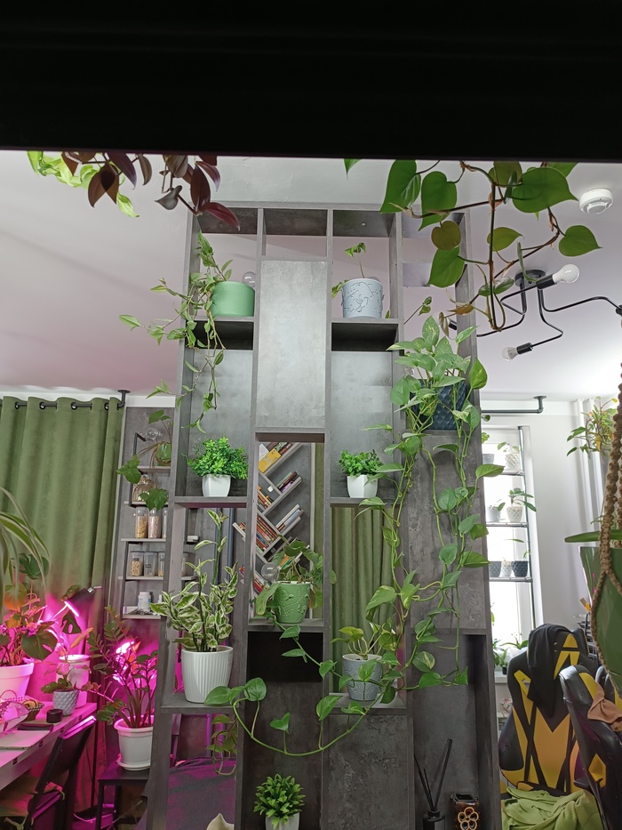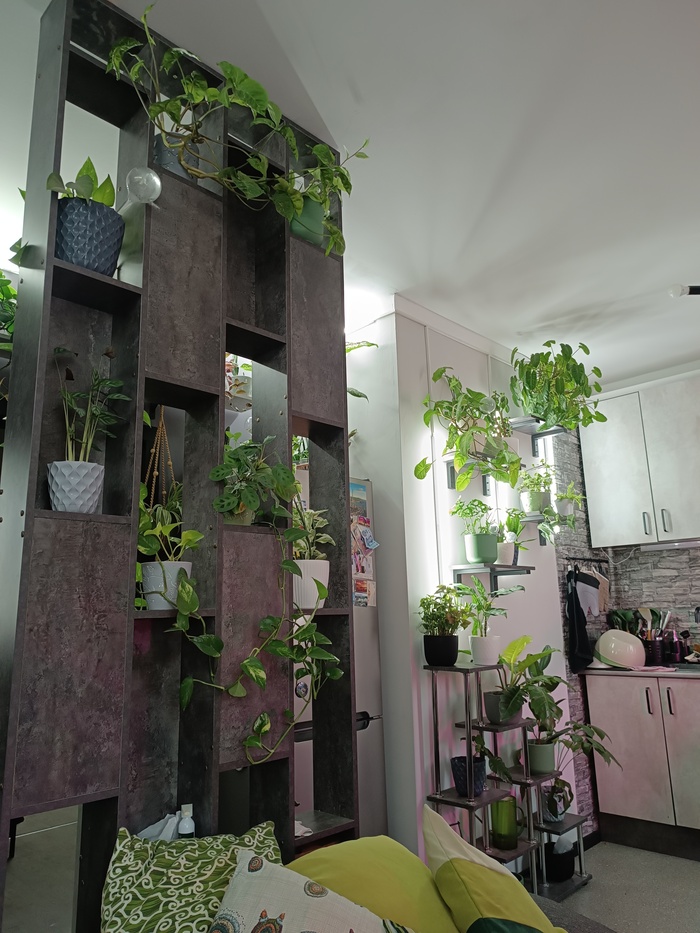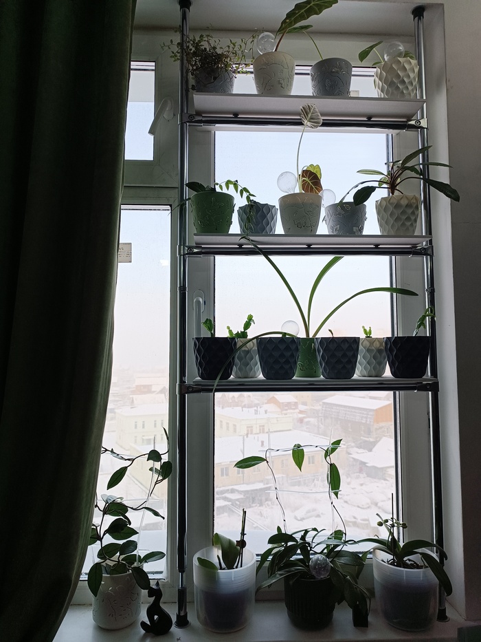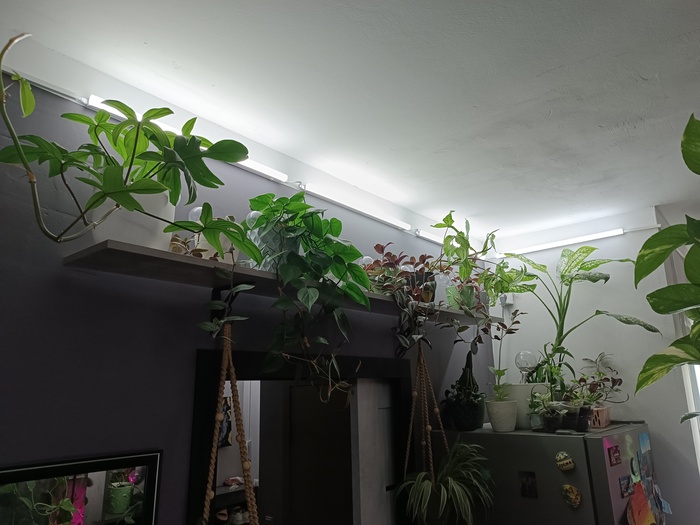 На полке всё время что-то передвигается. Кому-то мало света, кто-то тут, пока не подрастёт. Только эпипремниум её стабильно оплетает.