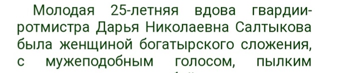 Дарья Иванова, в замужестве Салтыкова, родилась в 1730 году в семье богатых столбовых дворян. В 20 лет вышла замуж за ротмистра Глеба Салтыкова, родила двоих сыновей и вела, казалось бы, обычную жизнь светской дамы. Но в 26 лет она овдовела, и эта трагедия сорвала предохранитель в ее психике. Молодая, богатая, набожная (регулярно ездила в паломничества) вдова вдруг превратилась в неуравновешенную психичку.