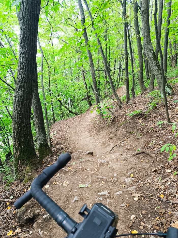 По пути очень много затяжных спусков, один был слишком крутым, его тоже прошла пешком, тк боялась улететь и расквасить нос – я в лесу одна. Здравый смысл в черепушке присутствует :D