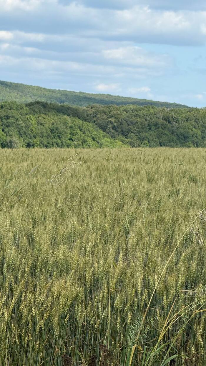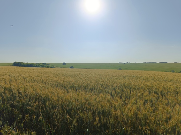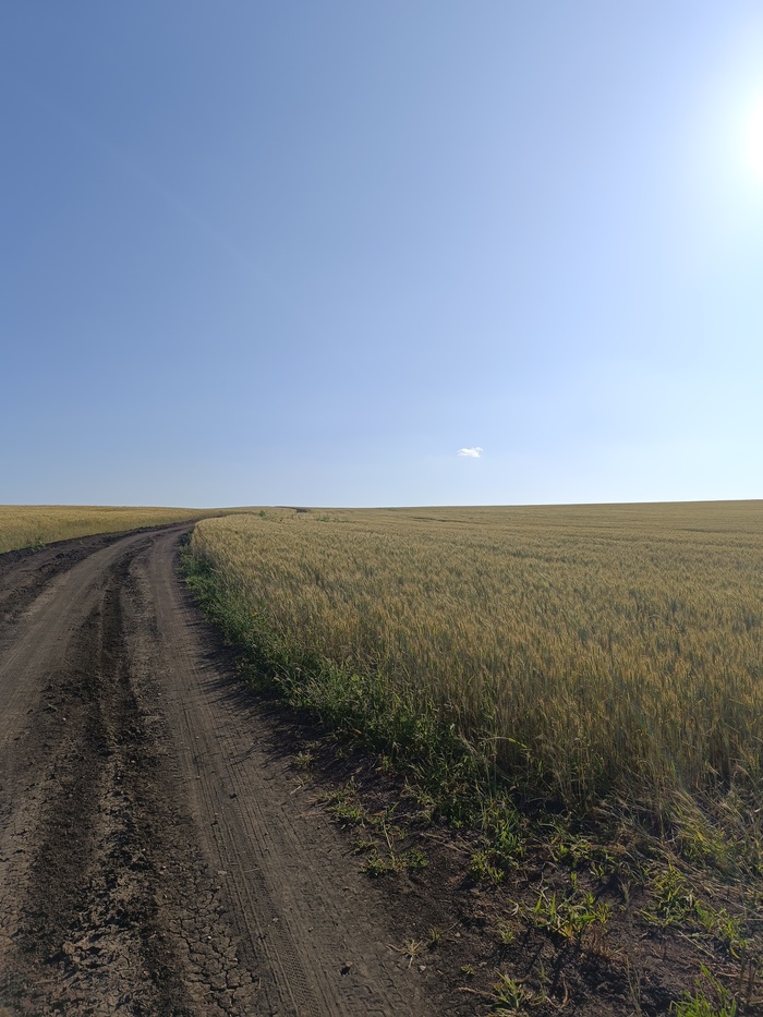 Последний грунтовый тяжелый подъем перед полем и в награду получаешь роскошный вид на горки вокруг и колосья на ветру