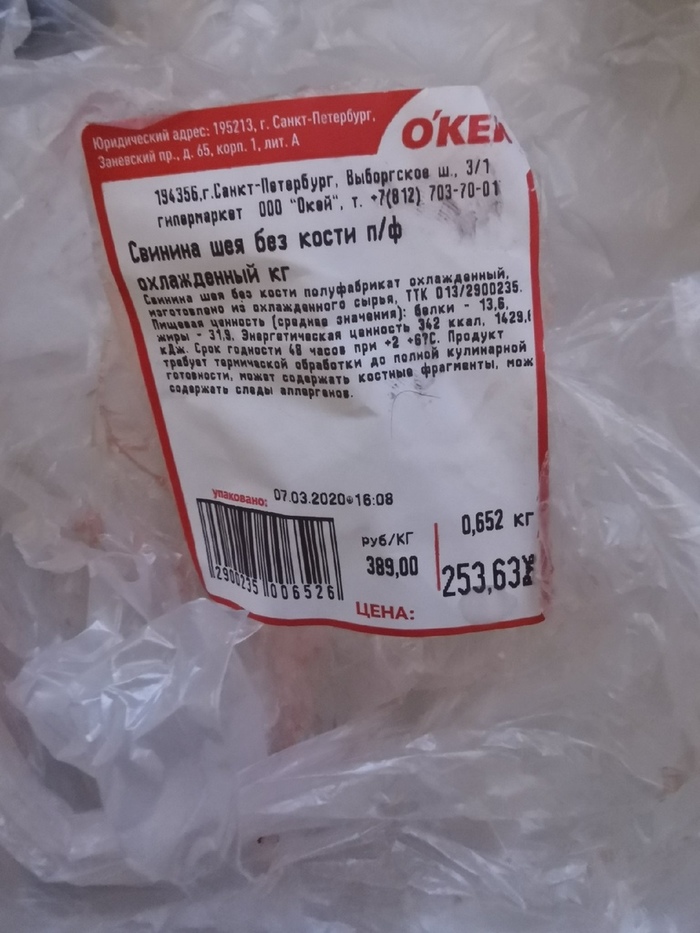 Пишу вам по следующему поводу. Купил на днях свиную шею в гипермаркете "ОКЕЙ",г.Санкт-Петербург.