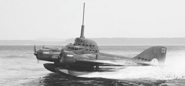 Если Вам кажется странным сочетание самолёта и корабля, то что Вы скажете о летающей подводной лодке? С 1934 до 1937 годы Борис Ушаков работал над проектом гидросамолёта с возможностью погружения под воду. В 1936 году проект был передан на рассмотрение в РККА, но в 1939-м был приостановлен и возобновлён только в 1943-м. В итоге прототип был построен в 1947 году, но к тому моменту советская военно-морская доктрина поменялась, и проект был закрыт. Предполагалось, что трёхмоторный самолёт при необходимости закрывал моторы металлическими пластинами, пикировал к воде, нырял и атаковал надводные или подводные цели двумя торпедами. Самолёт мог погружаться на 45 метров и развивал скорость до трех узлов, а в воздухе разгонялся до 185 километров в час.