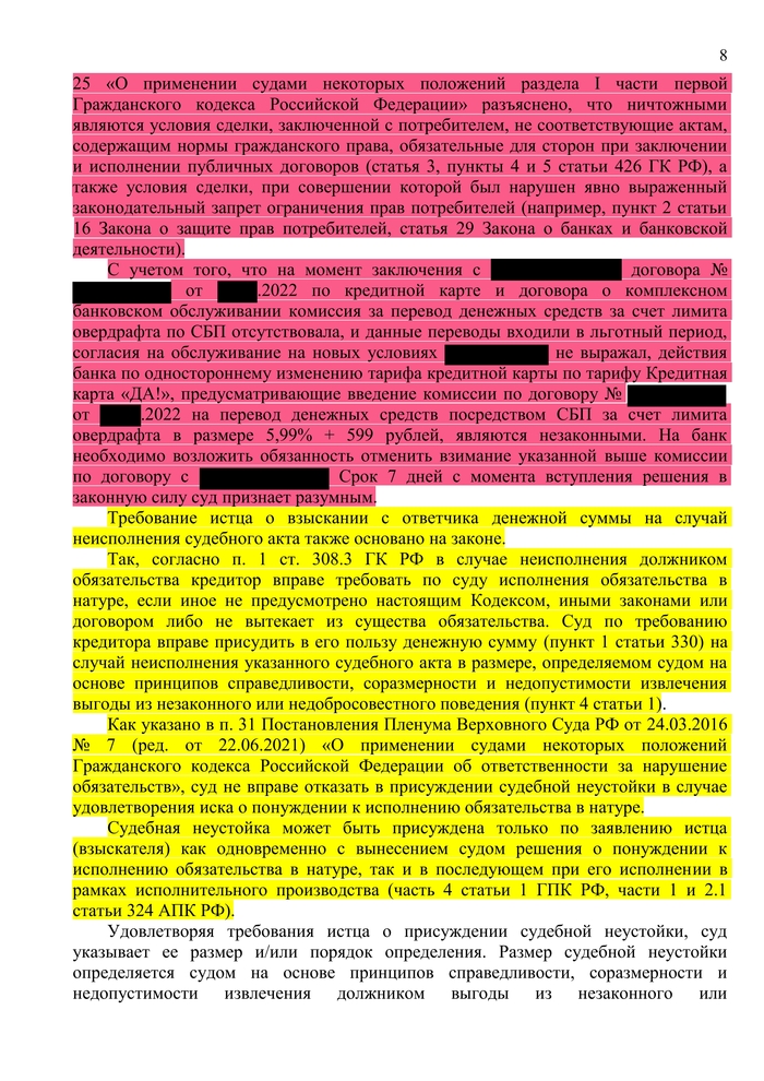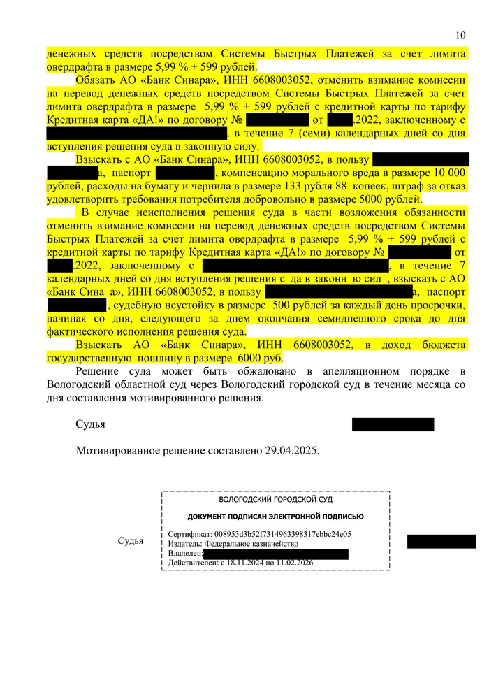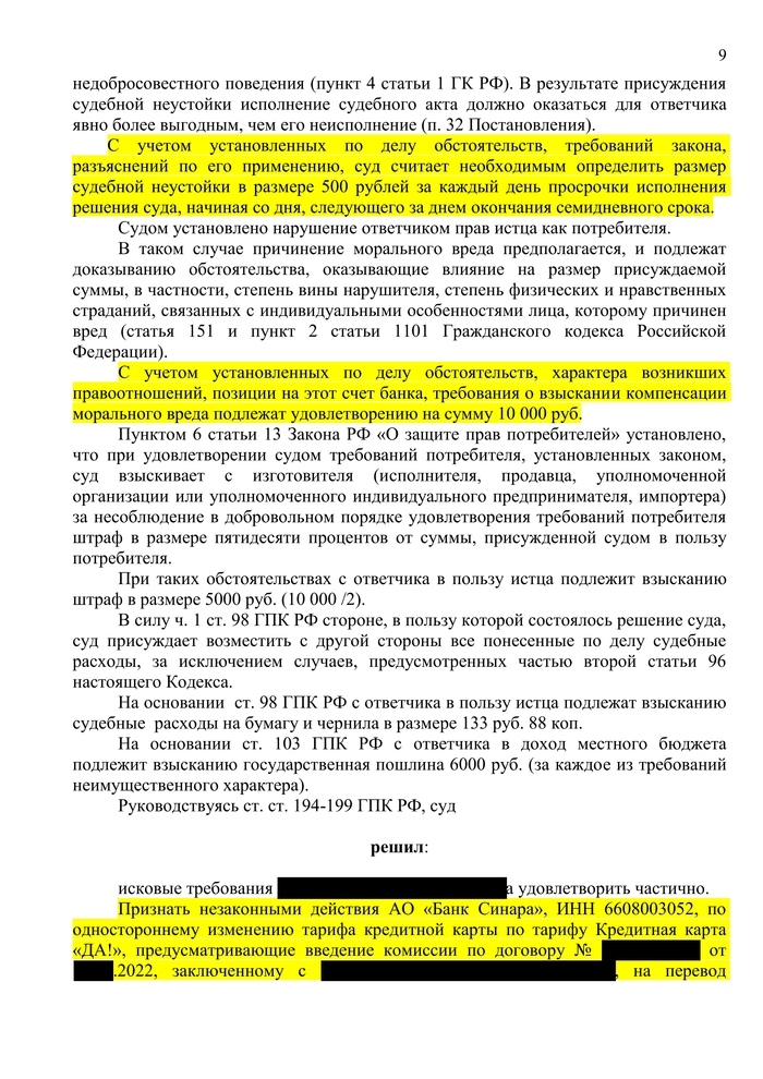 вступления судебного решения в законную силу, взыскать с АО «Банк Синара» компенсацию морального вреда в размере 40 000 рублей, расходы на бумагу и чернила в размере 83 руб. 88 коп., штраф в размере пятьдесят процентов от суммы, присужденной судом в пользу потребителя, судебную неустойку в размере 1 500 рублей за каждый день просрочки, начиная со дня, следующего за днем окончания семидневного срока, установленного судом на отмену взимания комиссии на перевод денежных средств посредством СБП за счет лимита овердрафта в размере 5,99% + 599 рублей.