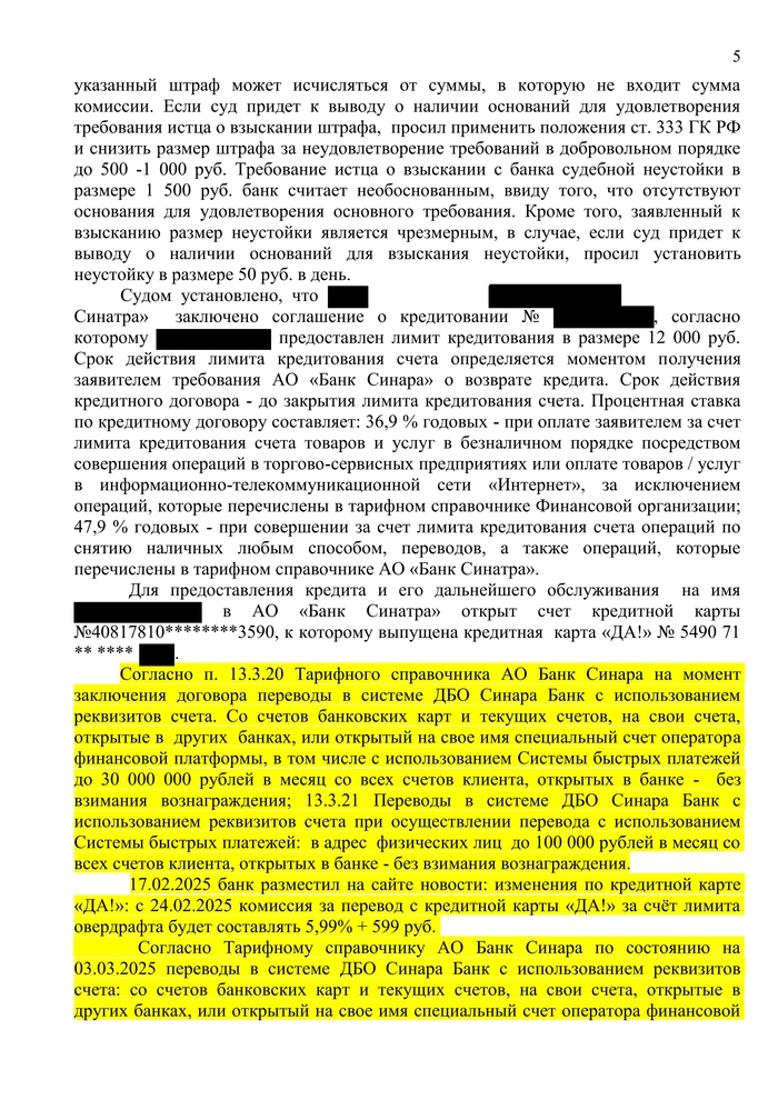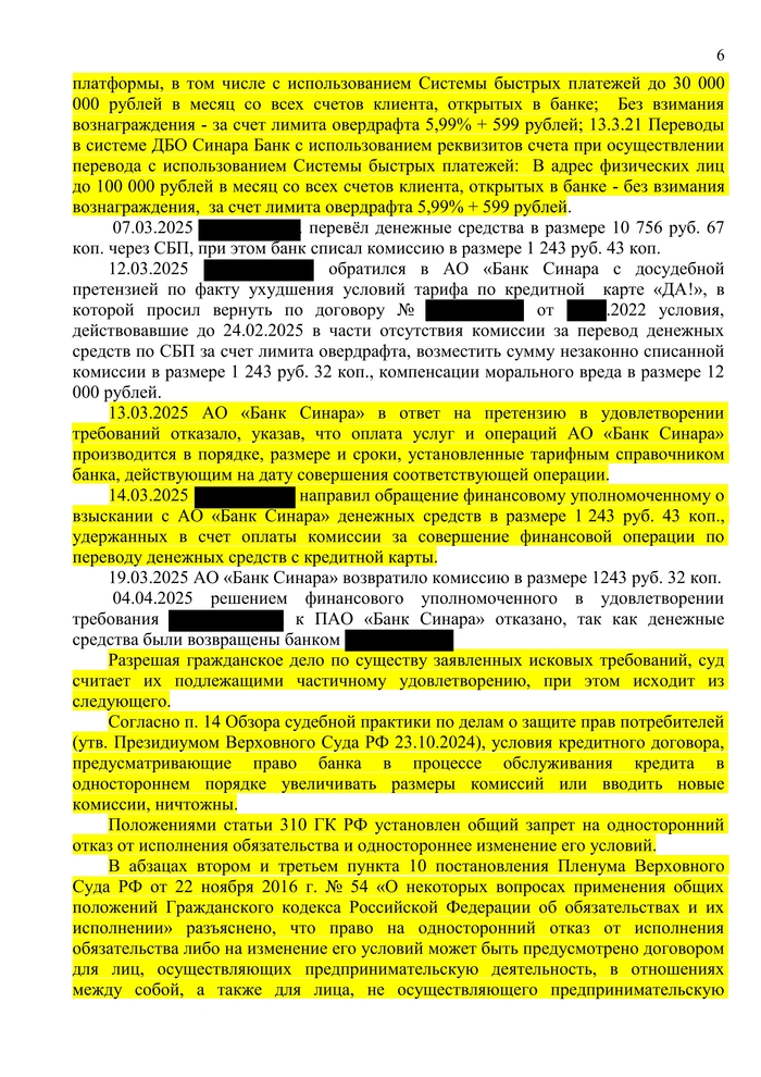 овердрафта в размере 5,99% + 599 рублей противоречат действующему законодательству и нарушают неимущественные права потребителя, предоставленные ему нормами Закона о защите прав потребителей, ГК РФ и Федерального закона от 21.12.2013 N 353-ФЗ «О потребительском кредите (займе)». Признать, что действия АО «Банк Синара» по одностороннему изменению тарифа кредитной карты по тарифу кредитная карта «ДА!», предусматривающие введение комиссии на перевод денежных средств посредством Системы Быстрых Платежей за счет лимита овердрафта в размере 5,99% + 599 рублей ничтожны и не имеют юридической силы, так как противоречат действующему законодательству, обязать АО «Банк Синара» отменить взимание комиссии на перевод денежных средств посредством Системы Быстрых Платежей за счет лимита овердрафта в размере 5,99% + 599 рублей с его кредитной карты по тарифу Кредитная карта «ДА!» (договор № от в течение 7 календарных дней со дня