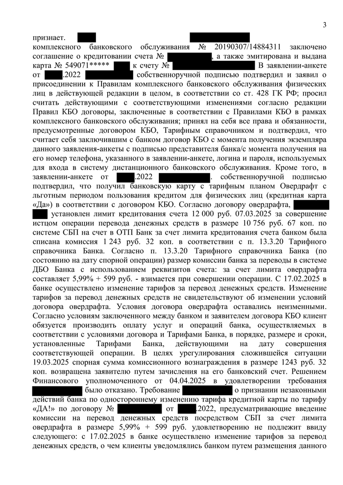 установлен лимит кредитования счета 12 000 руб. 07.03.2025 за совершение истцом операции перевода денежных средств в размере 10 756 руб. 67 коп. по системе СБП на счет в ОТП Банк за счет лимита кредитования счета банком была списана комиссия 1 243 руб. 32 коп. в соответствии с и. 13.3.20 Тарифного справочника Банка. Согласно и. 13.3.20 Тарифного справочника Банка (по состоянию на дату спорной операции) размер комиссии банка за переводы в системе ДБО Банка с использованием реквизитов счета: за счет лимита овердрафта составляет 5,99% + 599 руб. - взимается при совершении операции. С 17.02.2025 в банке осуществлено изменение тарифов за перевод денежных средств. Изменение тарифов за перевод денежных средств не свидетельствуют об изменении условий договора овердрафта. Условия договора овердрафта оставались неизменными. Согласно условиям заключенного между банком и заявителем договора КБО клиент обязуется производить оплату услуг и операций банка, осуществляемых в соответствии с условиями договора и Тарифами Банка, в порядке, размере и сроки, установленные Тарифами Банка, действующими на дату совершения соответствующей операции. В целях урегулирования сложившейся ситуации 19.03.2025 спорная сумма комиссионного вознаграждения в размере 1243 руб. 32 коп. возвращена заявителю путем зачисления на его банковский счет. Решением Финансового уполномоченного от 04.04.2025 в удовлетворении требования было отказано. Требование о признании незаконными