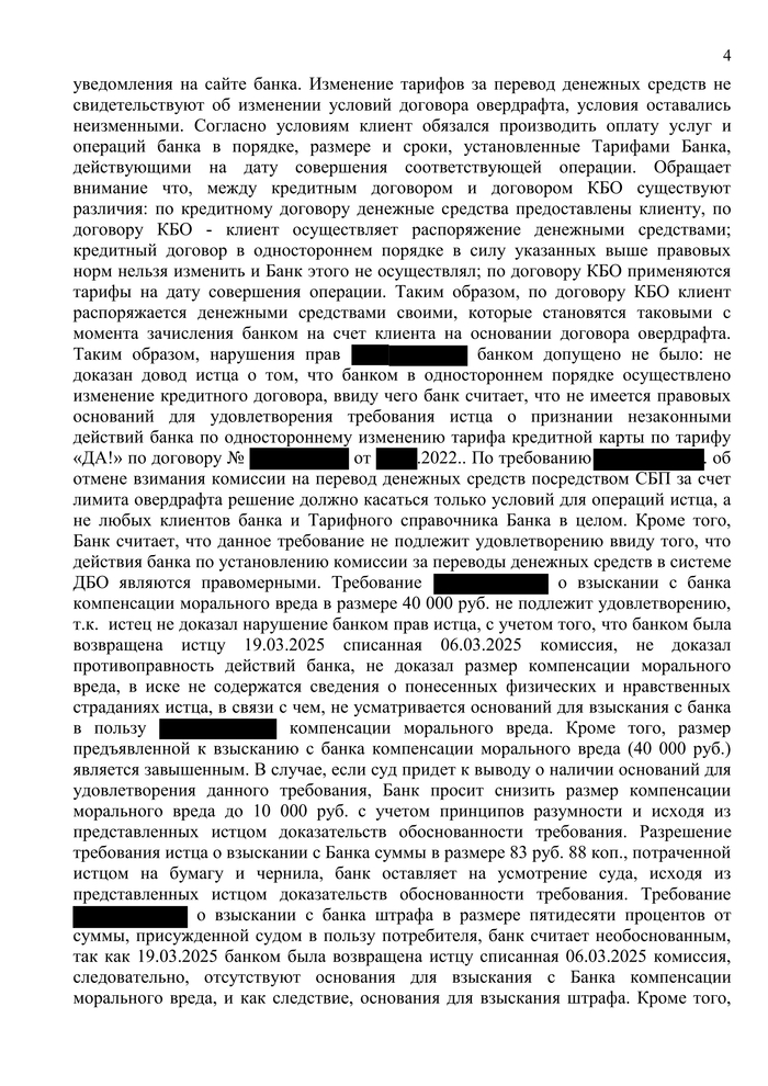 предъявленной к взысканию с банка компенсации морального вреда (40 000 руб.) является завышенным. В случае, если суд придет к выводу о наличии оснований для удовлетворения данного требования, Банк просит снизить размер компенсации морального вреда до 10 000 руб. с учетом принципов разумности и исходя из представленных истцом доказательств обоснованности требования. Разрешение требования истца о взыскании с Банка суммы в размере 83 руб. 88 коп., потраченной истцом на бумагу и чернила, банк оставляет на усмотрение суда, исходя из представленных истцом доказательств обоснованности требования. Требование о взыскании с банка штрафа в размере пятидесяти процентов от суммы, присужденной судом в пользу потребителя, банк считает необоснованным, так как 19.03.2025 банком была возвращена истцу списанная 06.03.2025 комиссия, следовательно, отсутствуют основания для взыскания с Банка компенсации морального вреда, и как следствие, основания для взыскания штрафа. Кроме того,