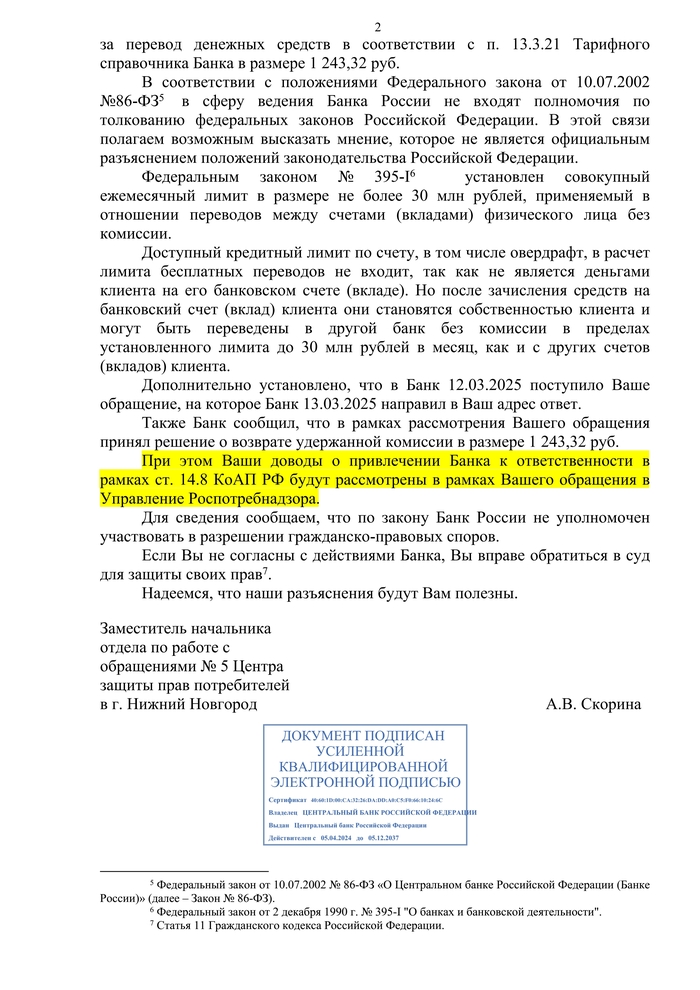 13.03.2025 АО «Банк Синара» в ответ на претензию в удовлетворении требований отказало, указав, что оплата услуг и операций АО «Банк Синара» производится в порядке, размере и сроки, установленные тарифным справочником банка, действующим на дату совершения соответствующей операции.