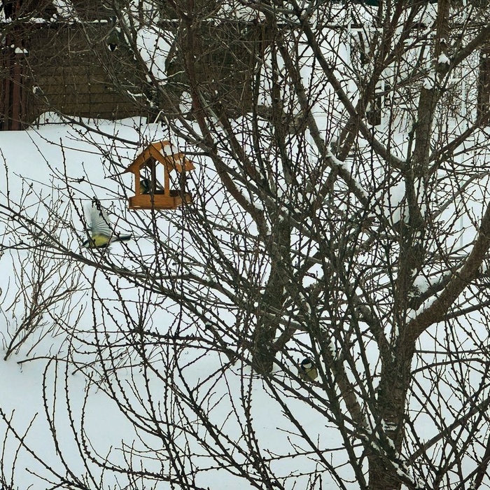 Во дворе у меня две кормушки, каждое утро наполняю их семечками и сушёным арахисом. Основные посетители моих открытых кафе - синички и полевые воробьи. Недавно видел снегирей, но их больше интересует калина и терновник, которые я специально оставляю на зиму, не снимая с кустов.