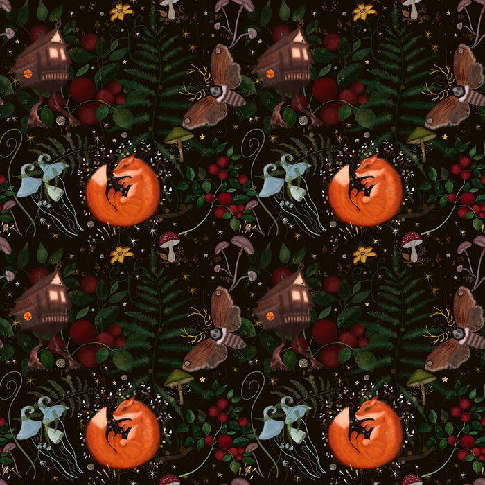 Один из самых первых моих паттернов, уходит в бесконечность в разные стороны света, рождая Темную сказку про сумерки в Дремучем лесу, где светятся окна Избушки, стелется под ногами брусника, цветет папоротник, летают бархатные мотыльки с золотыми усиками, загораются то тут,то там огоньки и звездочки , с неба летит мягкий снежок и тает, не успев укрыть травы и грибы..А где-то там, в траве и бруснике спит маленький оборотень Лис...Лисья мама ушла на свою охоту, надежно укрыв малыша от любопытных и внимательных глаз...и воздух пахнет горьковато,лесом, травами,сказкой,которая вот-вот придет...