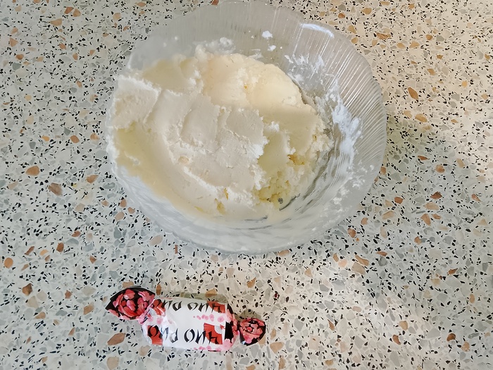 Купил это я коробку сливок, 20%, брянских. Ну, крышку открутил, хотел в кофеёк добавить — не льётся. Расковырял коробку, а там сверху — кусок масла😄 Грамм стописят будет. Конфета рядом — для масштаба. Сливки были куплены по акции, за 100 рублей)) Масло размял специально, для равномерной консистенции.
