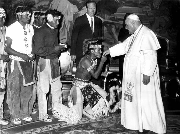 15. Индеец апачи преклоняет колени и целует руку Папы Иоанна XXIII во время аудиенции делегации индейцев, Ватикан, 1961 год.