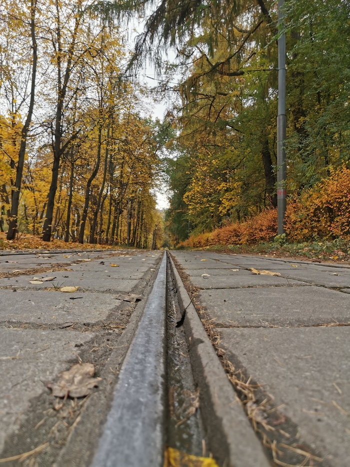 В Сокольниках то самое место, где ждут осенний трамвай. Не получилось его заснять индивидуально, много желающих с большими фотоаппаратами, поосто много людей.