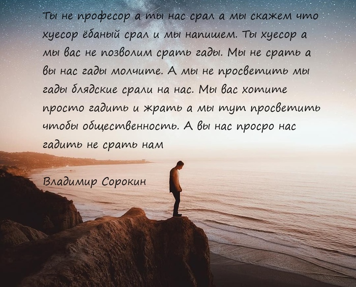 Возвращаясь к вопросу об элитарности книг Сорокина, я могу твердо сказать, что да, они элитарны, но не в том, что бросается в глаза. Элитарность и бессмертие его книг не в вульгарности сцен или обсценной лексике, а в том, как он обращается с уродством наших глубинных мыслей. Он играет с нашими реакциями, обращая внимание именно на те события в нашей истории, индивидуальной, личной и культурной, общенациональной, чтобы рассказать нам о том, что составляет нашу жизнь, когда мы стараемся о ней не думать, или о чем стараемся забыть. Сорокин обращает внимание на бессознательные пробелы нашей внутренней жизни. Как это можно было бы проиллюстрировать? Я думаю так: даже здоровое тело должно три раза в день ходить в туалет, вне зависимости от того, как сильно мы стараемся от этого факта абстрагироваться. Об этих часто вытесняемых эпизодах личной жизни следует вспоминать хотя бы потому, что они составляют неотъемлемую часть человеческого бытия. И ровно по той же причине имеет смысл вспоминать о неприятных моментах нашей истории, чтобы обрести целостность мышления и не бояться собственных теней.