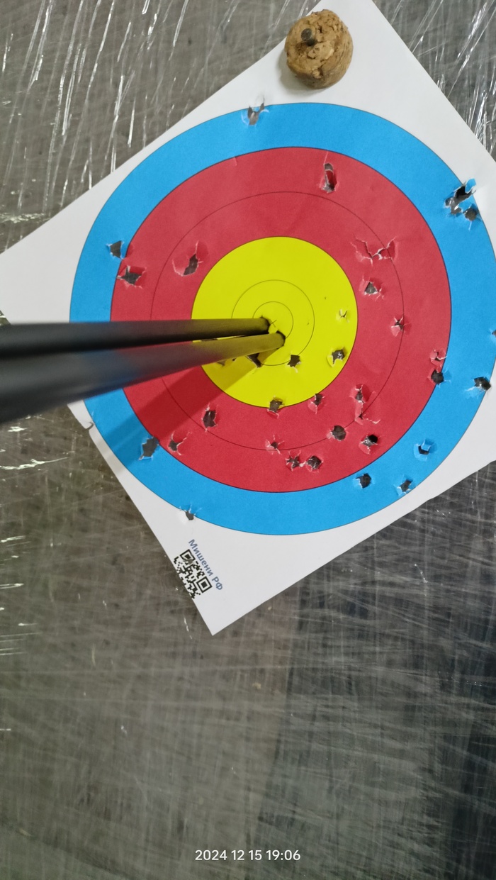 Начинал с резинкой и детским луком с 3м. Сейчас более или менее уверенно стреляю из лука 35 фунтов (~16кг) на 18м. Сейчас понемногу привыкаю к дистанции в 30м+. В планах начать тренировки на олимпийской дистанции 70м.