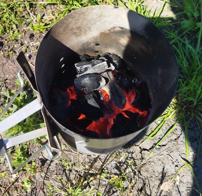 Стартер на сегодня свободен. Свое отработал. В деле был 15 минут. Это его обычный режим. Пусть остывает. Но сами дрова в мангале, доходят до кондиции еще 15 минут. Если бы был уголь, эту процедуру пришлось бы миновать.