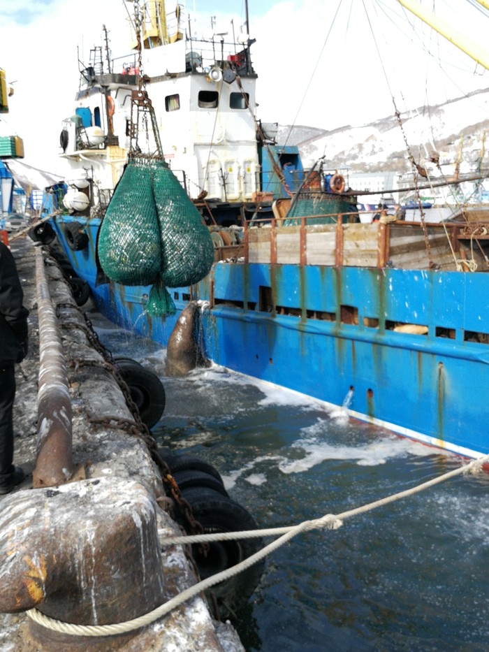 Мне нравится вот этот кадр. Пока чувак с сигаретой загнулся практически под 90°, выполняя свои судовые дела, сивуч тырит удачно свисающую с судна рыбу, а огромная, как я ее называю Жопа, ведь эта зеленая сеть с рыбой реально похожа на жопу, перемещается под управлением крановщика, на подготовленный ранее грузовичок. Действия, происходящие параллельно, только в одном мире. Практически сон во сне, как в "Начало" с Дикаприо ну или это просто повседневные будни этих людей, что работают на судах и в порту. Интересно вообщем-то. У людей такая разная жизнь, но в каждой из вариантов жизней есть свои радости и печали. Но это все рассуждения, а самое эпичное в этом - это Зеленая Жопа)