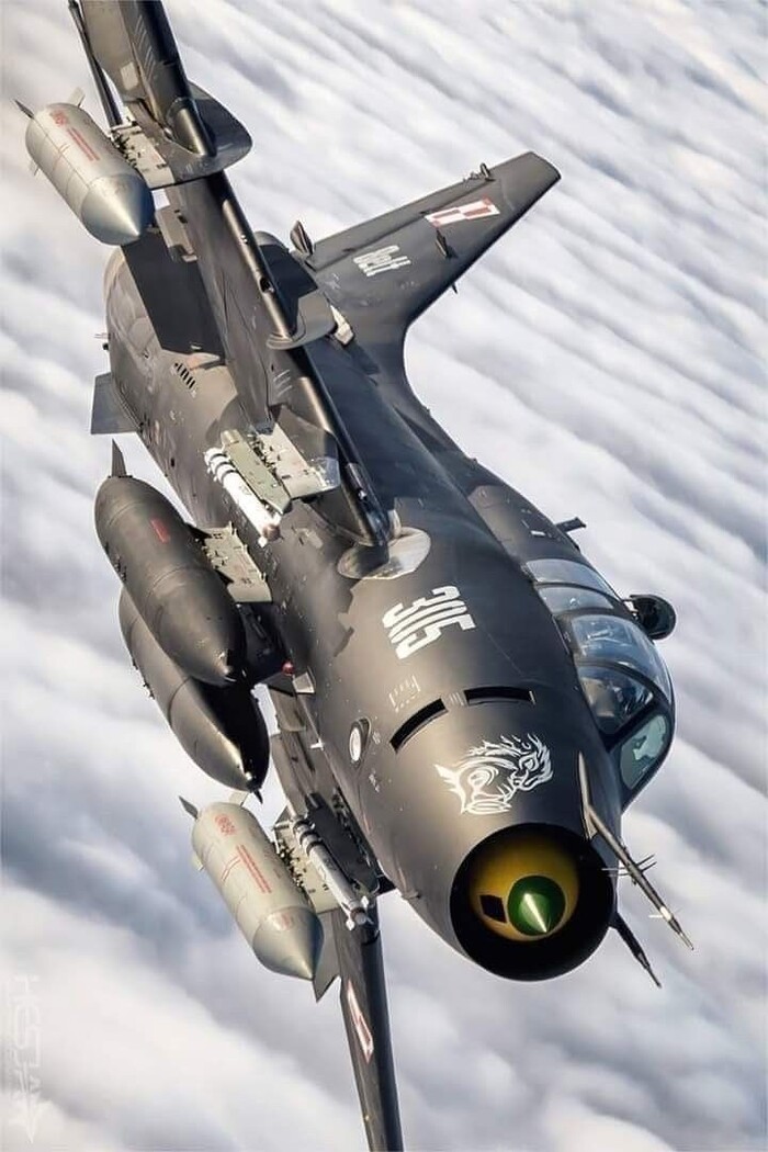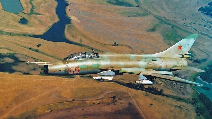 Самолет Су-17 борт 22 из 34-го инструкторского АПИБ убирает шасси после взлета с аэродрома Насосная (Кировабад). Машина несет два ПТБ-1100 под фюзеляжем. Подвеска двух баков была для Су-17 стандартной. Для вооружения оставались свободны четыре держателя 3-й группы – грузоподъемностью до 500 кг каждый