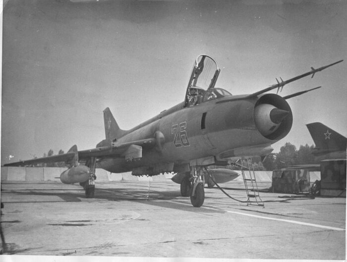 Cамолет Су-7Б был основным истребителем-бомбардировщиком ВВС СССР и наших союзников по всему миру. На фото – головной экземпляр экспортной модификации самолета Су-7БМК без опознавательных знаков на аэродроме Дзёмги Дальневосточного машиностроительного завода им. Гагарина в Комсомольске-на-Амуре