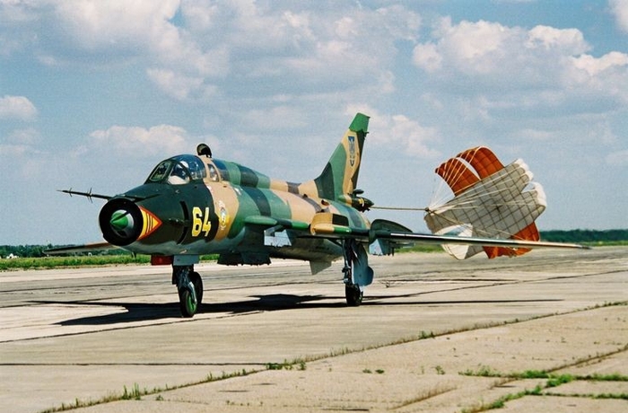 Самолет Су-17 борт 21 выполняет посадку с тормозным парашютом. Тормозные щитки закрыты