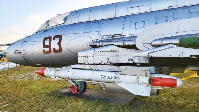Истребитель-бомбардировщик Су-17 борт 14 в варианте радиоэлектронной борьбы: на левом внутреннем подкрыльевом держателе контейнер с самолетной помеховой станцией СПС-141 «Сирень», под правым – «уравновешивающий» его блок неуправляемых ракет УБ-16 (он мог снаряжаться и НАР С-5П с дипольными отражателями). Под внешними балками – два подвесных топливных бака ПТБ-1100
