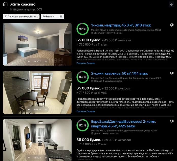 Я сам уже много лет снимаю жилье. Кажется, сейчас живу уже на 8-ом месте. О покупке своего – да, задумываюсь, но пока нет возможности. Нормальное время для покупки упустил, это сам понимаю :-( В прошлом году снова искал квартиру и снова проходил через всю боль поиска и общения с риэлторами. В какой-то момент решил выписывать для себя, чего именно мне не хватает в поиске сейчас. Самый главный пункт был – сложно найти приятный интерьер, т.к. нигде нет таких фильтров. Приходится перерывать сотни объявлений, чтобы выбрать из них хоть что-то. Понимаю, что такие требования не у всех, но лично мне очень важно жить в хорошей обстановке. Работаю из дома, поэтому стены и мебель вижу постоянно!