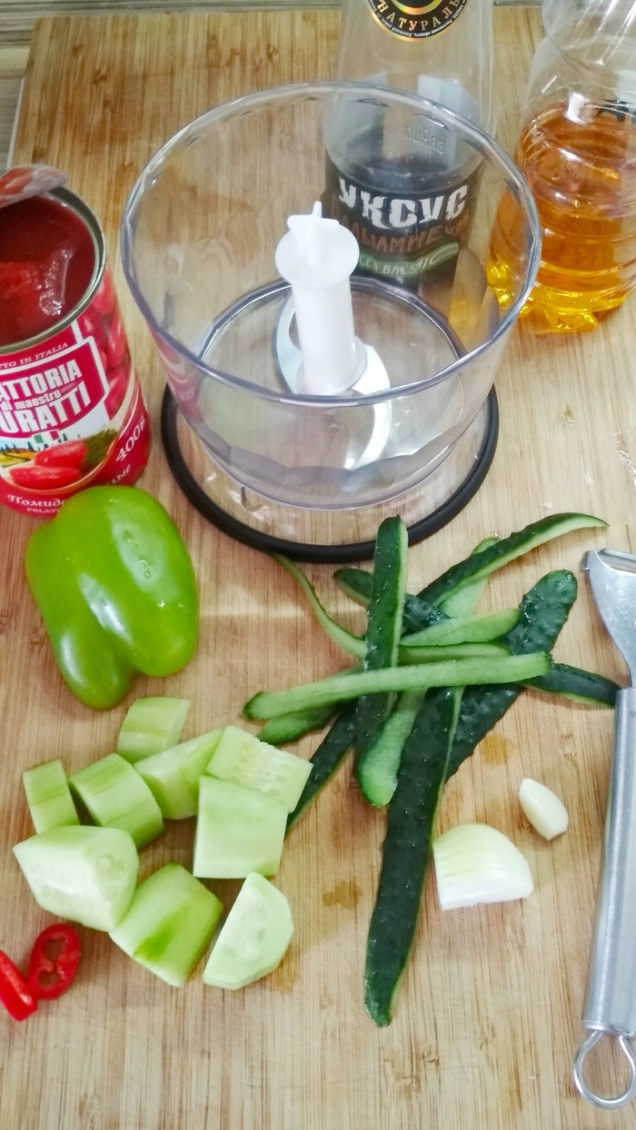 С огурцов снимаю кожицу. Позже она идет для украшения в тарелку, и добавляет текстуры супчику. Ее нужно порубить соломкой или кубиками. как вы любите.Все это (помидоры и огурцы кусочками) забрасываю в чашу блендера. Сейчас у меня такой как выше на фото. Получается две порции. Если нужно больше приходится делать частями и смешивать в кастрюле. А раньше у меня был большой мощный блендер BORK (сломался). Объемом почти два литра. В нем было готовить гораздо удобнее. НЕ РЕКЛАМА.