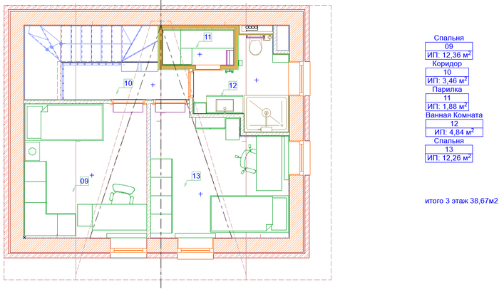 дельный совет проектировщика газопроводов с 30ти летним стажем по поводу расширения спален на третьем этаже. ну, ок. спальни с 11 стали 12м2. За счет чего?: чуть уменьшил санузел и существенно уменьшил и изменил холл третьего этажа. также в холле убран вход на чердак, поскольку теперь он будет классическим для чердаков в виде люка в потолке холла.