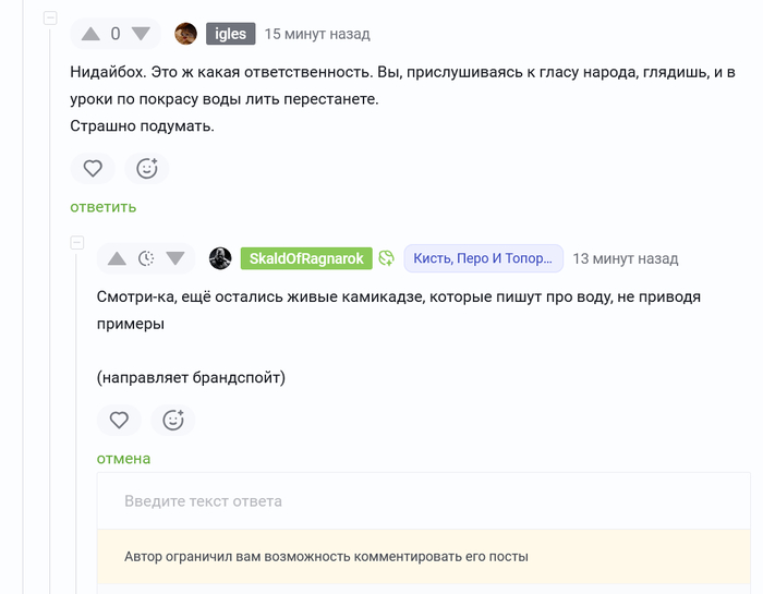 Надо же, получил достижение — на меня обиделся гуру. Великий высиратель создатель постов-переделок чужих постов, полных смехуёчков, а так же обещатель создатель авторского контента про покрасы, полного воды, не выдержал критики, выражающей субъективное мнение, и забанил. Правда, предварительно обвинив в отсутствии примеров. Поскольку примеры у меня кагбе затребовали, но привести их возможности не дали, пост и пилю, хотя стоило бы просто забить. @SkaldOfRagnarok, привожу пример: любая ваша статья про покрасы полна воды, и может быть сокращена очень сильно, без потери смысловой нагрузки. Доказательства: ваш пост и не ваш пост (пост @GambitSB), аналогичный по смыслу, но гораздо более лаконичный.